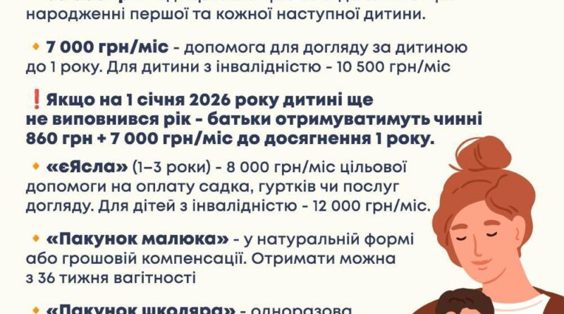 Виплати за народження дитини 2026 року зростуть до 50000 тисяч гривень замість попередніх 41280 гривень. Також держава виплачуватиме 8000 гривень з догляду за дитиною 1-3 років за програмою “Ясла”. А вагітні, які не працевлаштовані офіційно, додатково матимуть 7000 гривень.