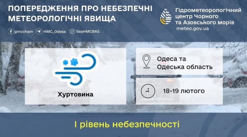 Найближчі 1-3 години 18 лютого очікується хуртовина, збережеться до кінця дня 18 лютого та вночі 19 лютого.