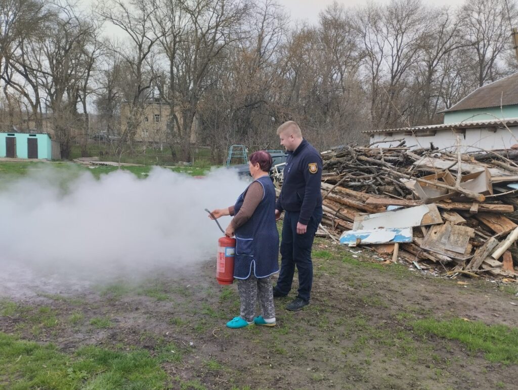 Теоретичні знання учасники закріпили на практиці — відпрацювали навички користування вогнегасником та дії у разі виникнення загоряння.